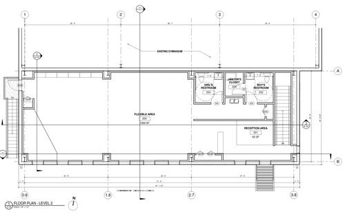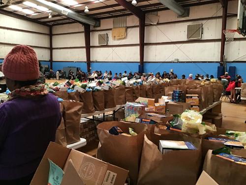 The ground level of the community center work flow for food distribution consists of entering the rear door of the gym to a check in window, proceeding to a waiting area, from there to a food distribution area, thence exiting into the parking lot.
